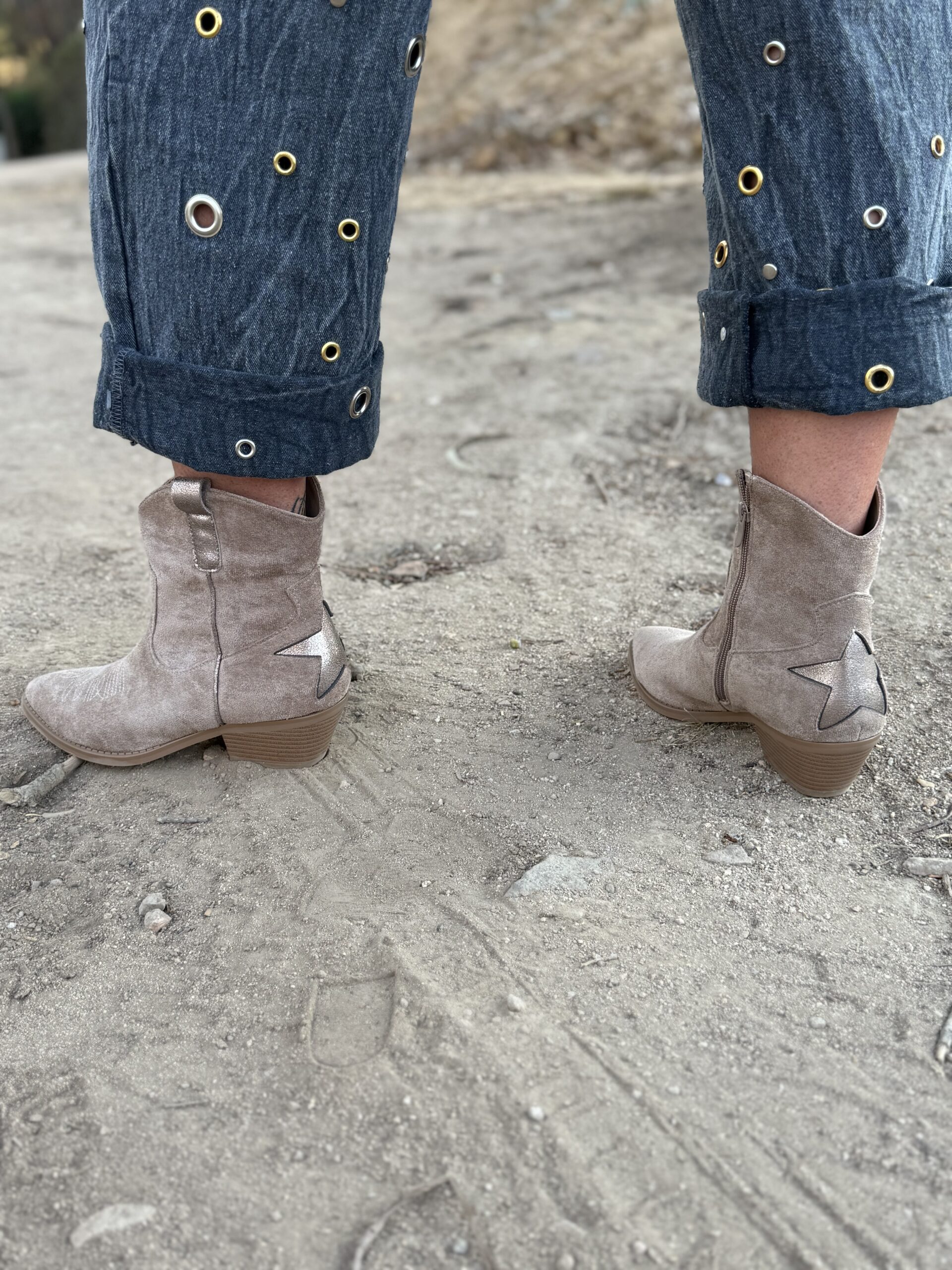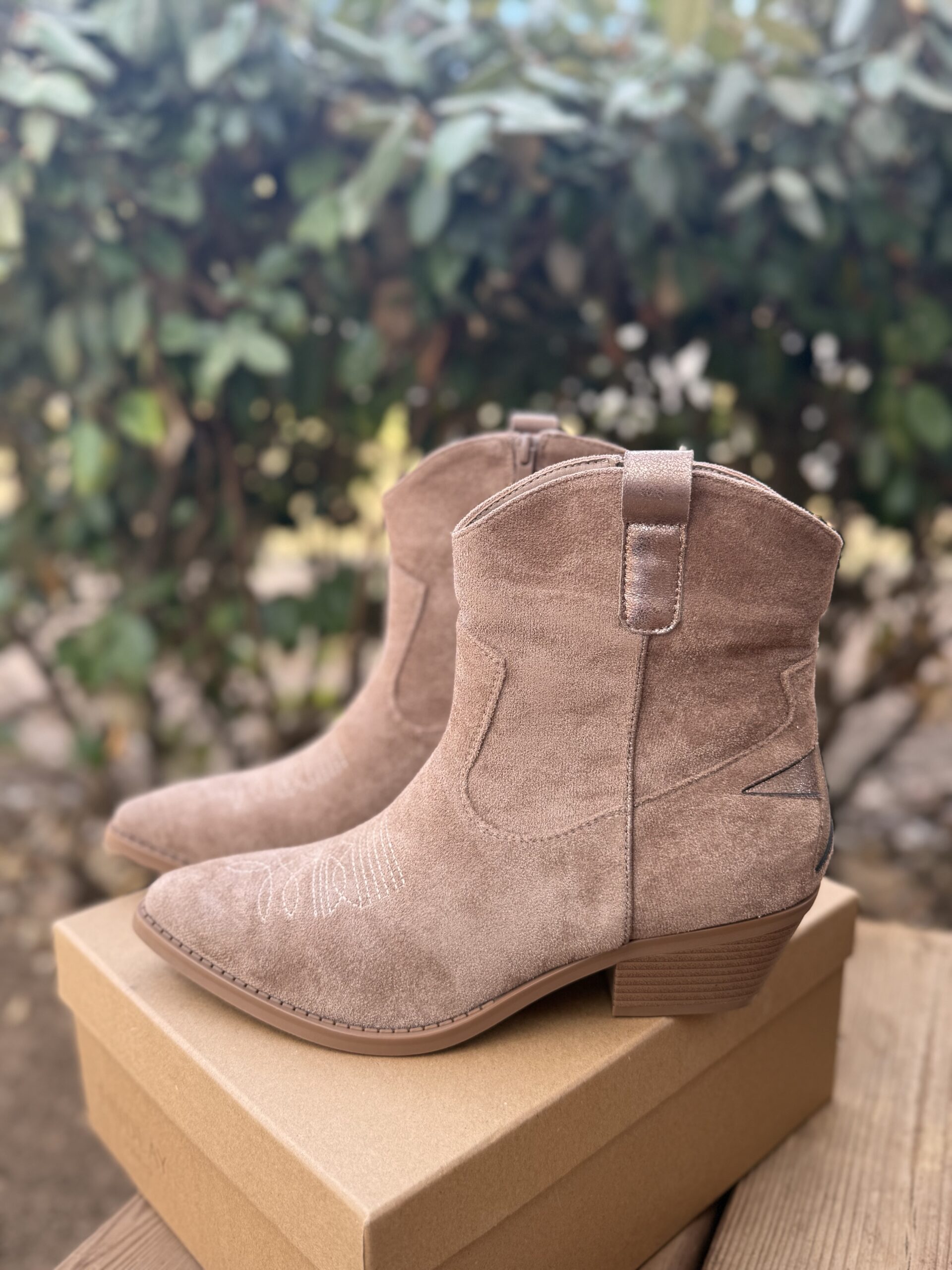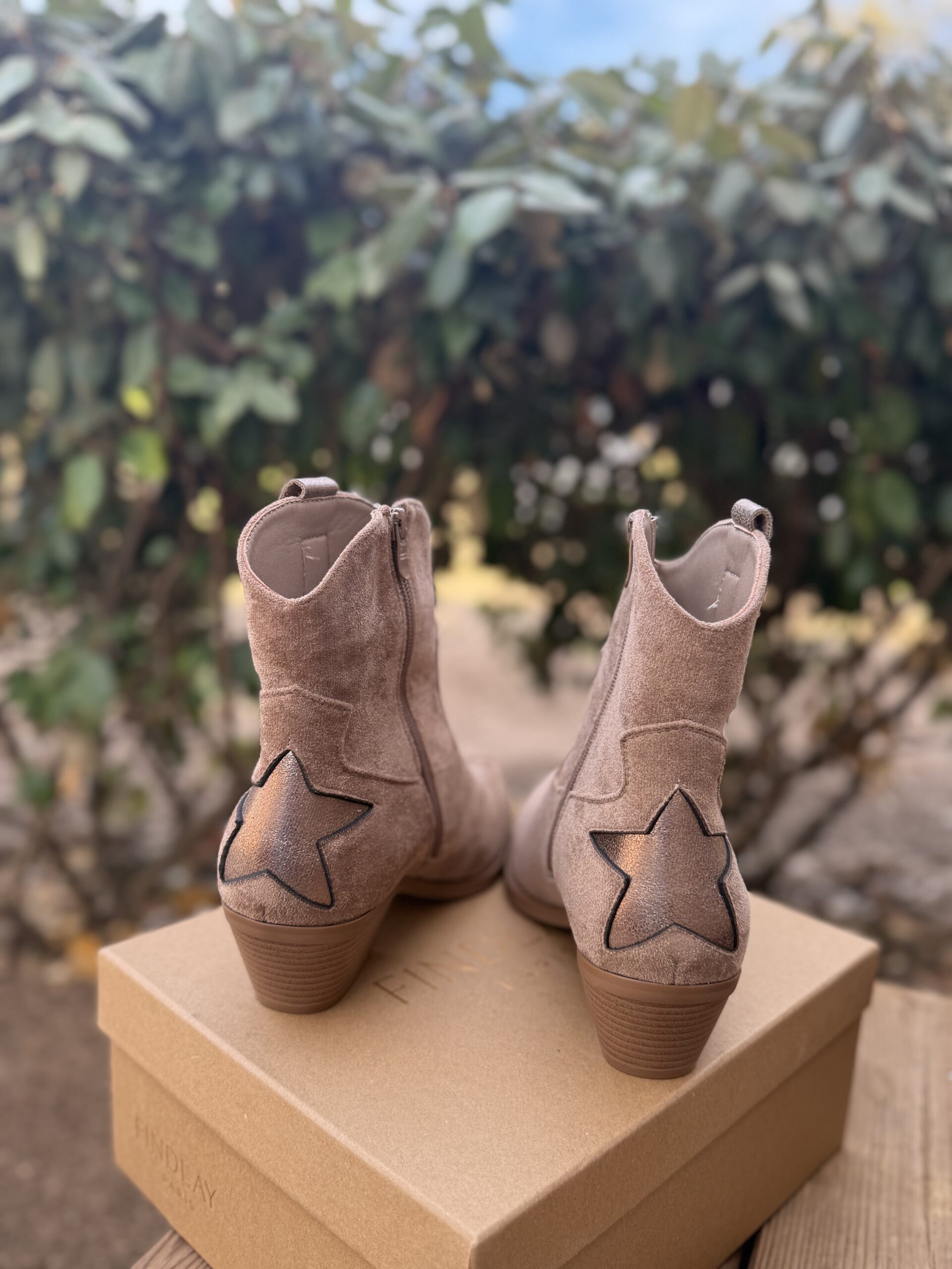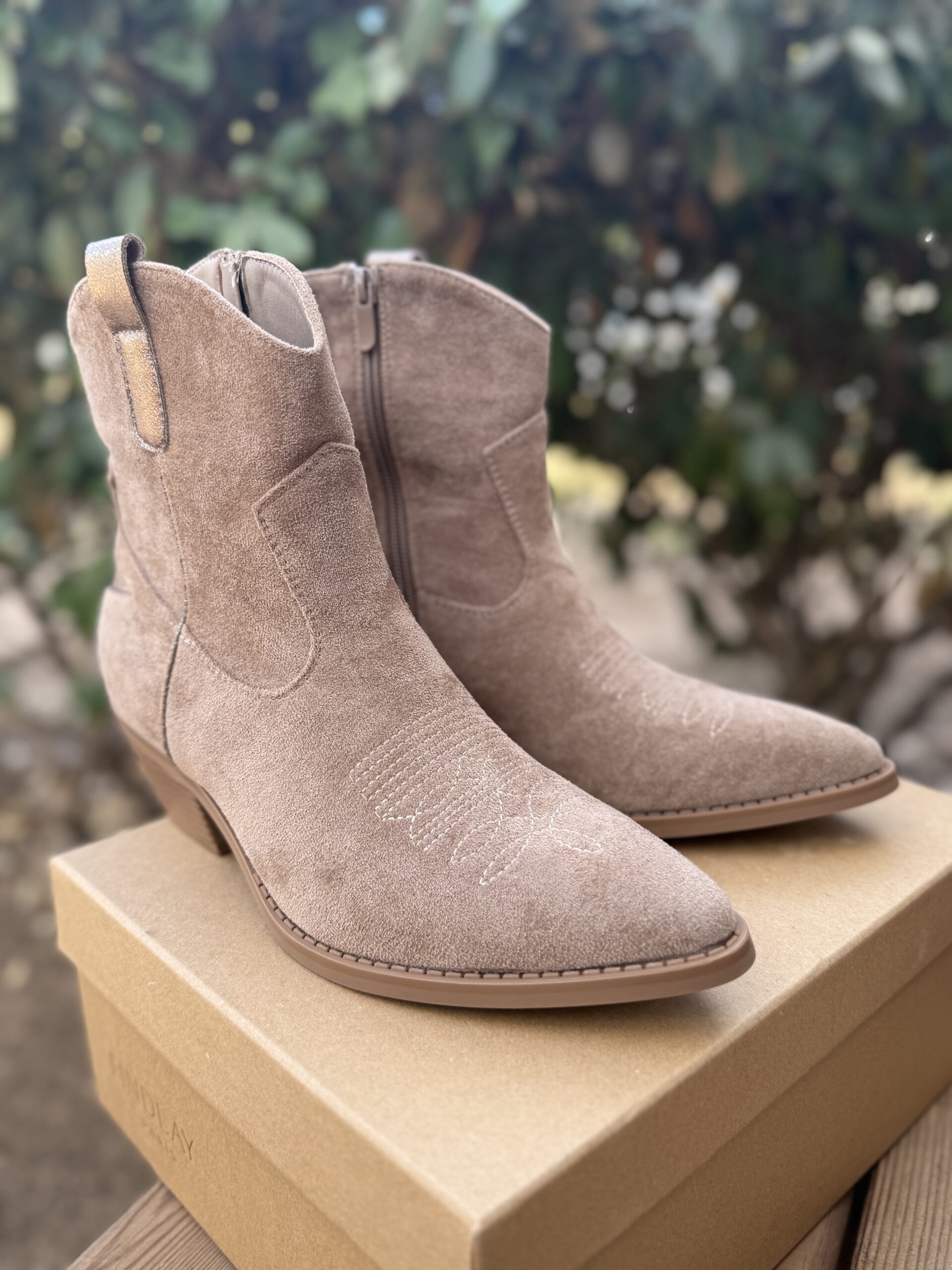 Conçues en daim effet suédé, elles allient confort et élégance avec leur coupe western revisitée. Leur couleur sable douce et lumineuse en fait une paire intemporelle, parfaite à porter en toutes saisons.