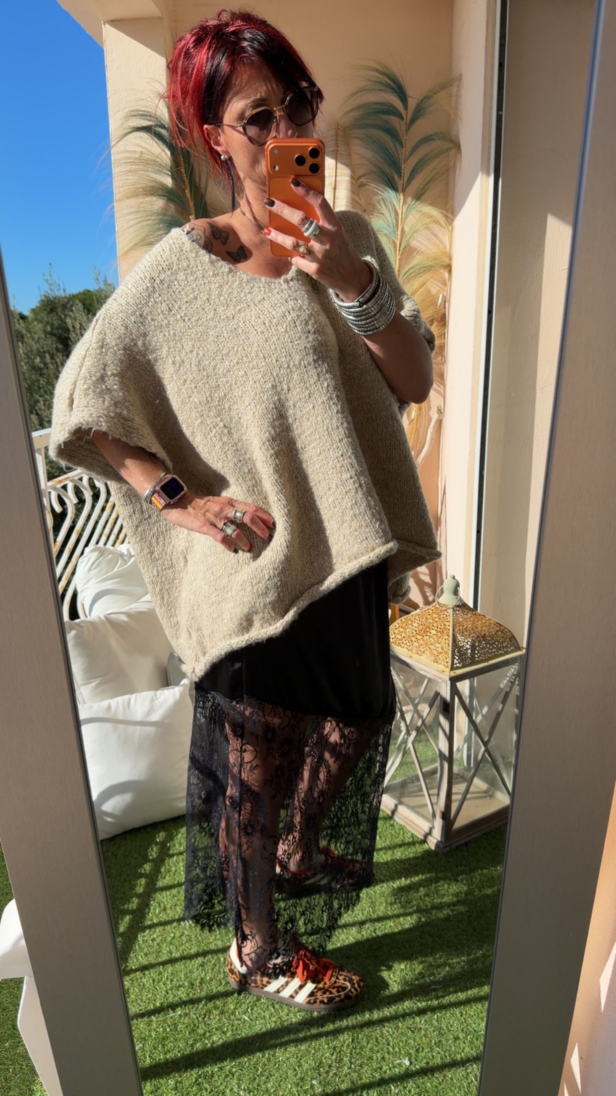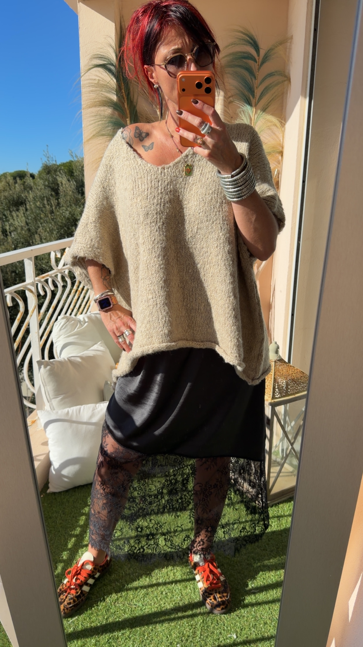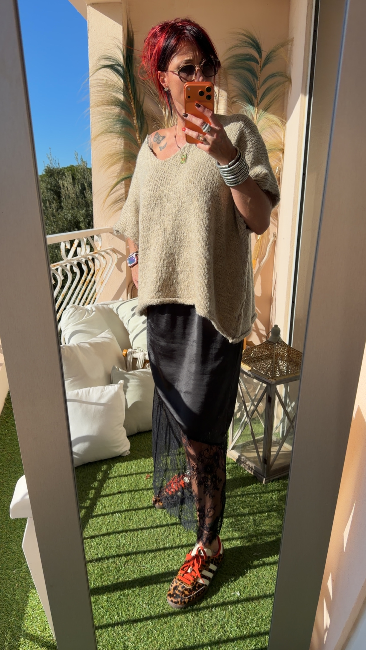 Sublime jupe taille unique au style bohème-rock, conçue avec une base fluide noire et une magnifique dentelle longue qui apporte du caractère et de la féminité. Son tombé asymétrique met en valeur la silhouette sans mouler, pour un look confortable mais ultra stylé. À porter aussi bien avec un pull oversize, un gilet loose ou un perfecto pour un look affirmé, original et 100% So’Room by Lilou.