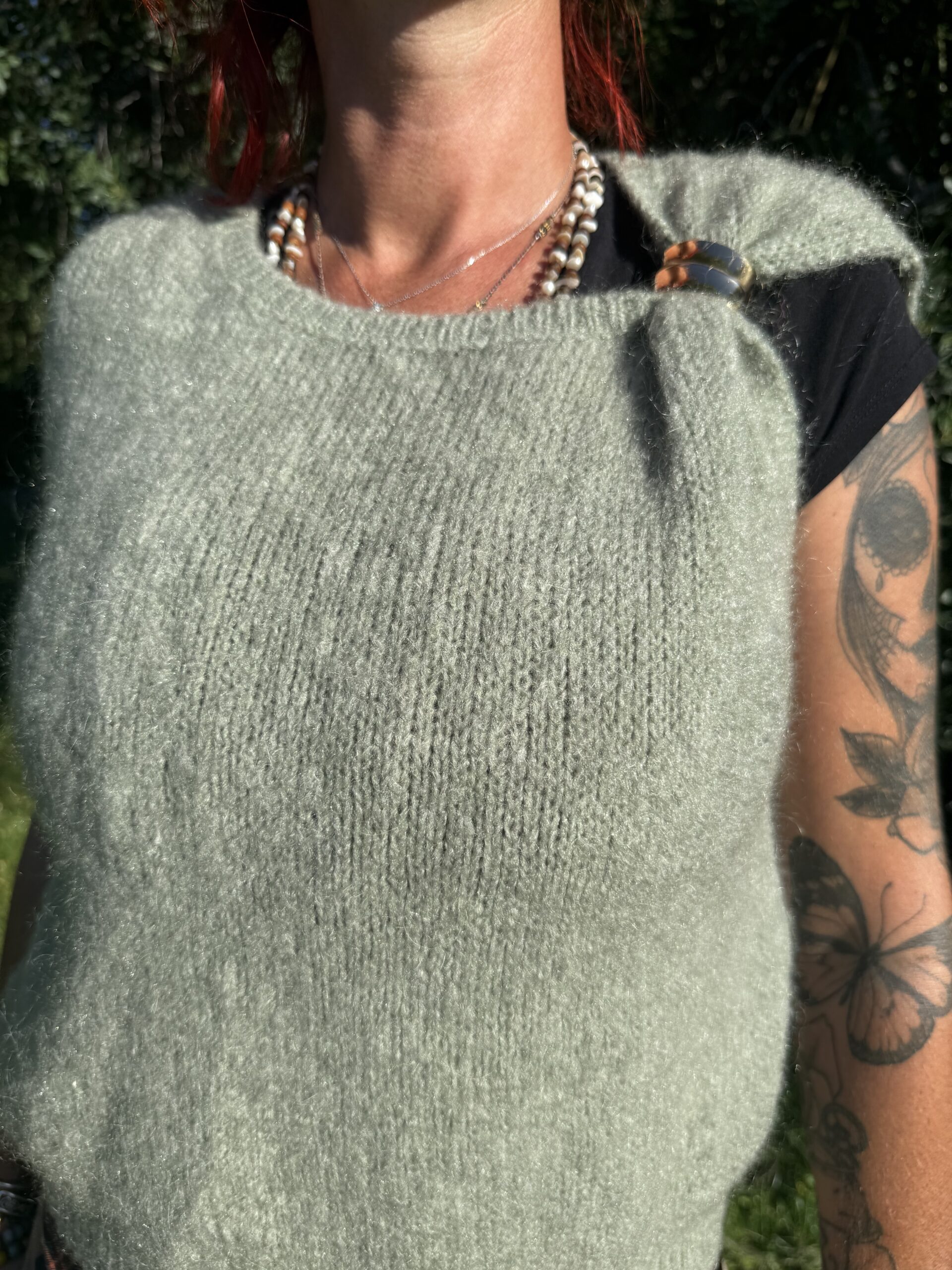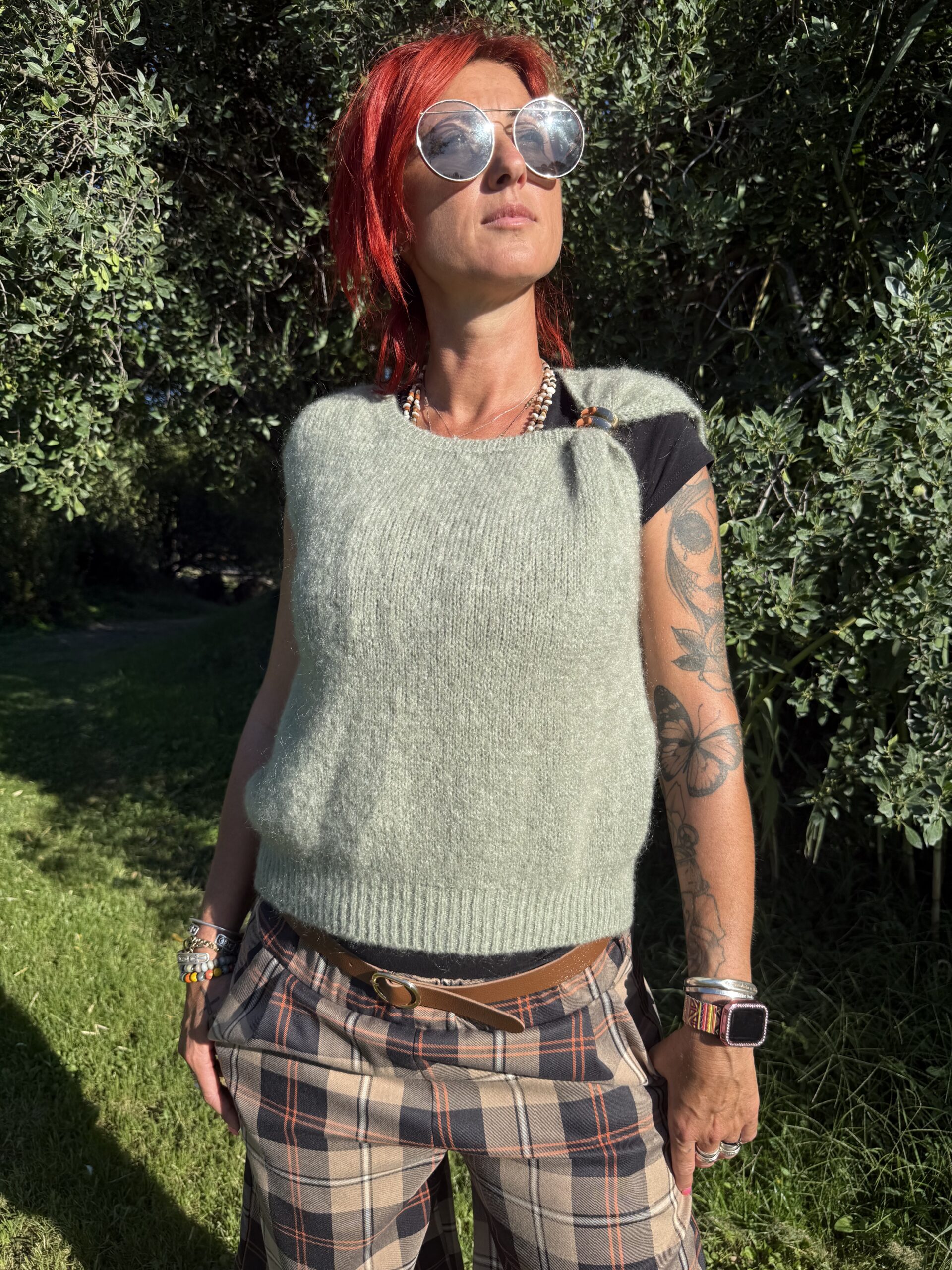 Craquez pour notre pull sans manches en maille douce vert sauge, une pièce incontournable pour vos looks bohèmes et tendances.